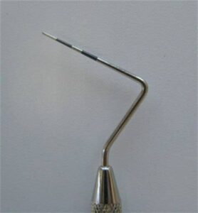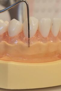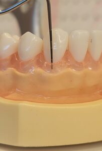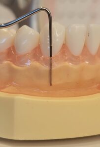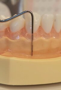 歯周病の検査は、歯と歯ぐきの隙間(ポケット)の深さをメモリのついた器具で測っています。